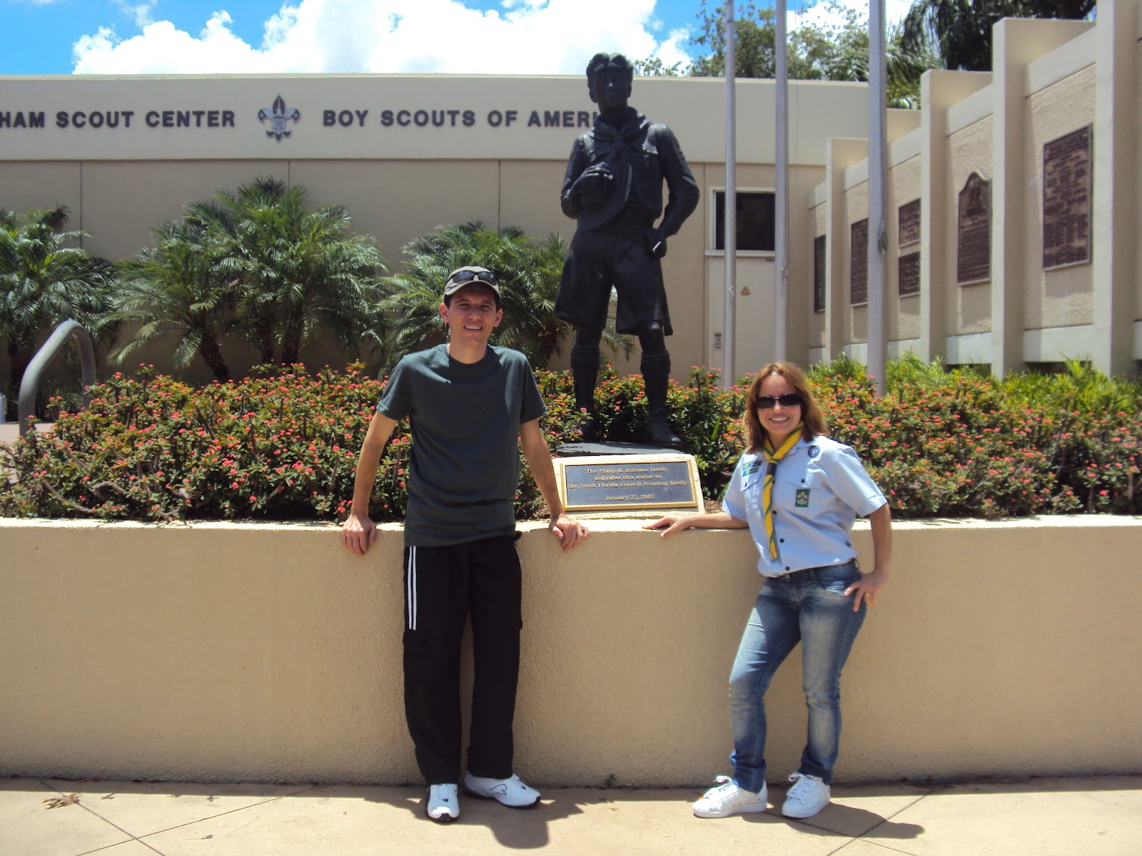 “Uma vez escoteiro, sempre escoteiro”! E, por isso mesmo, quando eu e meu marido viajamos aos Estados Unidos programamos em nosso roteiro uma visita a algum grupo de lá. Infelizmente, não encontramos grupos em atividade no dia, mas conhecemos a regional do sul da Flórida – South Florida Council – Boy Scouts of America. Como qualquer bom escoteiro, levei na mala lenços, distintivos e bonés para serem trocados. Claro que, para ficar ainda mais emocionante, coloquei meu traje. Sem contar que fiz meu passaporte escoteiro, que pode ser apresentado em qualquer grupo em qualquer lugar do mundo.Fomos muito bem recebidos, desde a Myrna da recepção, o pessoal da loja e até o diretor da regional, que só falava inglês. A curiosidade pelo Brasil era grande por parte deles, principalmente ao que se refere ao escotismo. A nossa também sobre o escotismo lá. Quando entreguei o lenço do 9 Grupo Escoteiro Tubarão para cada um deles, nossa, adoraram. Ainda mais que nosso lenço é verde e amarelo, cores que representam também o nosso país. Imediatamente, retribuíram com distintivos, lenços, bonés e até caneca.