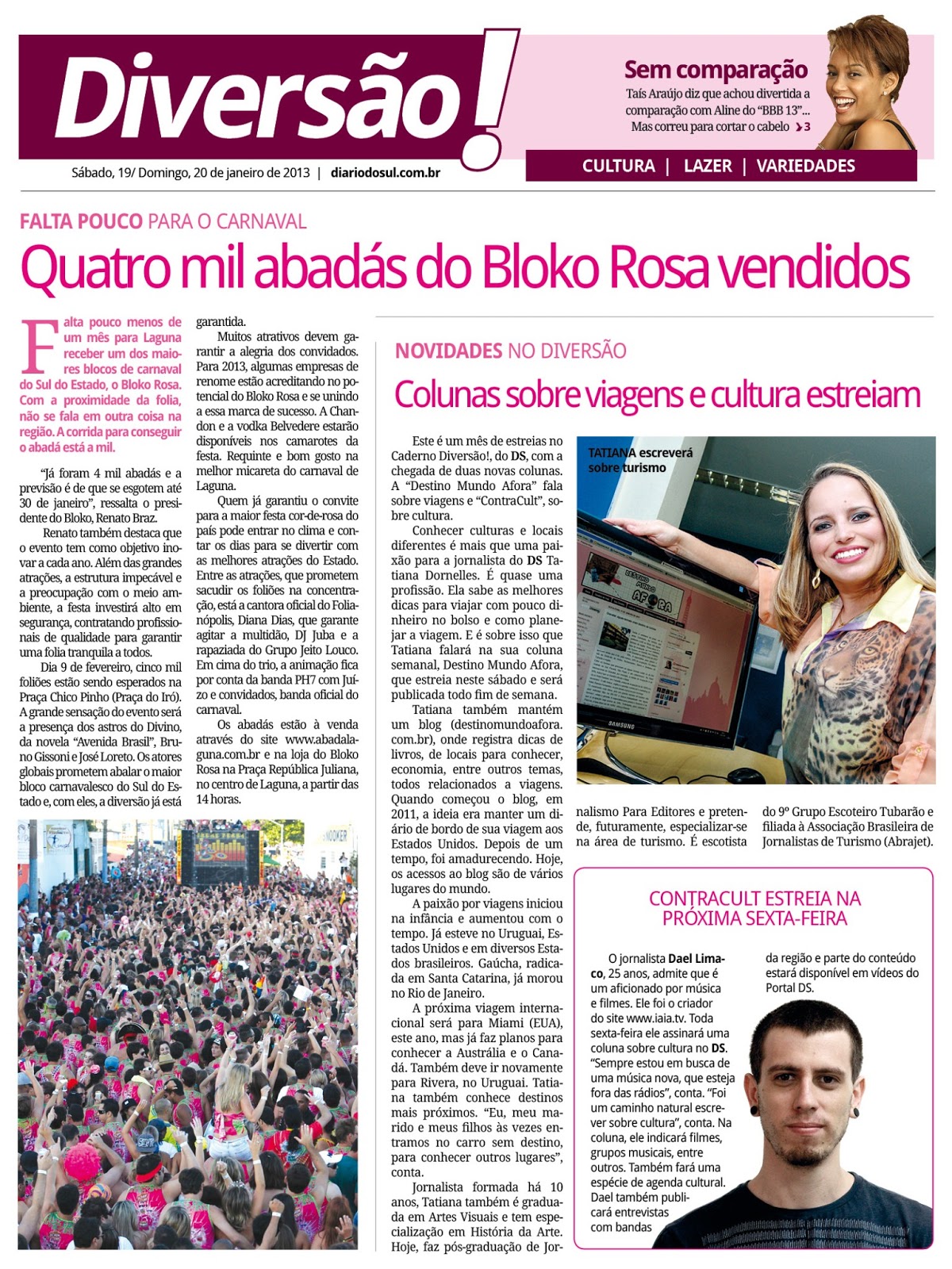 21/01/2013 Matéria sobre estreia da coluna Destino Mundo Afora no Diário do Sul Postado por: Tatiana Dornelles Tweetar Matéria sobre a estreia da coluna Destino Mundo Afora no jornal Diário do Sul. Data: 19 e 20 de janeiro de 2013.
