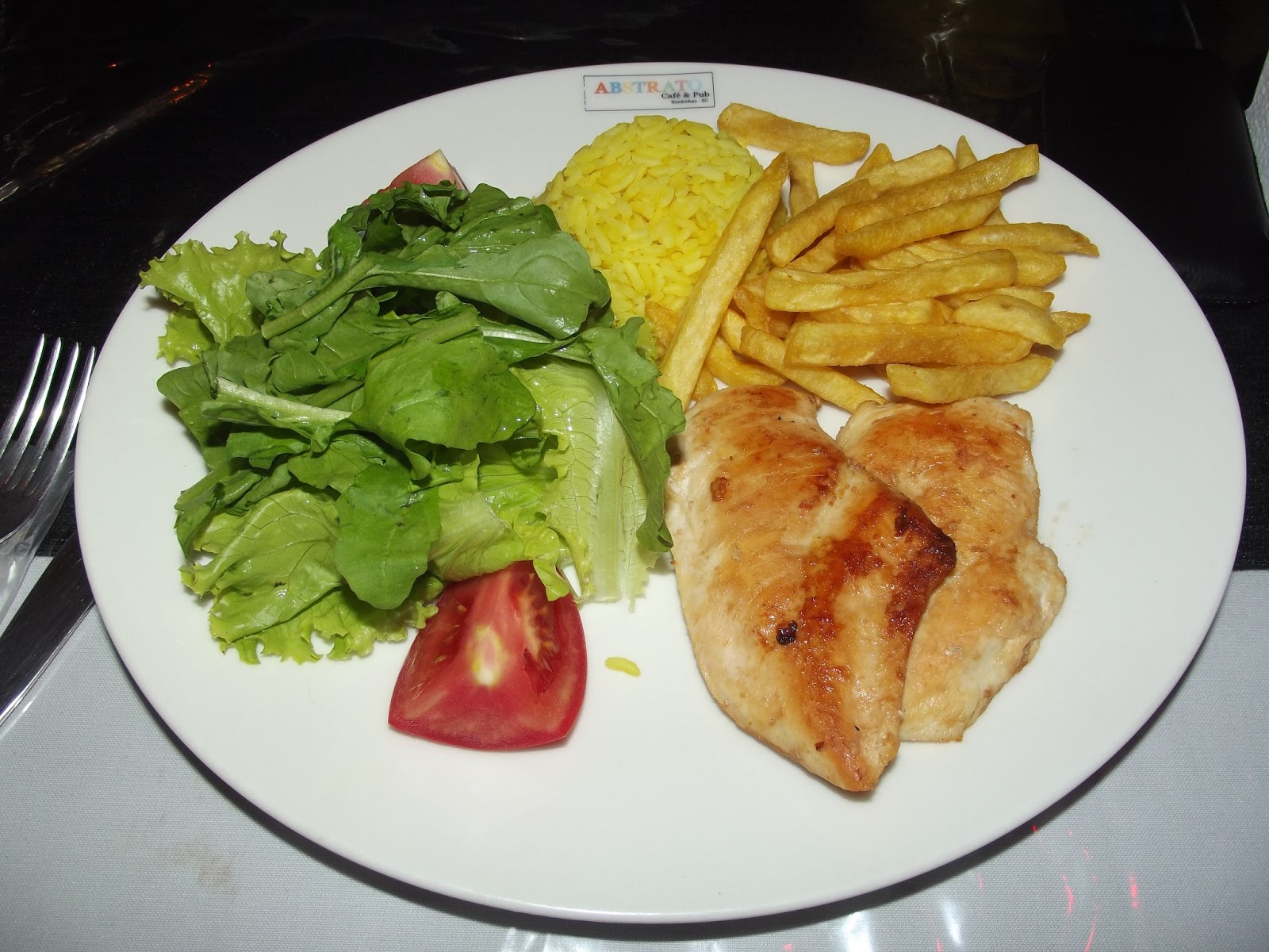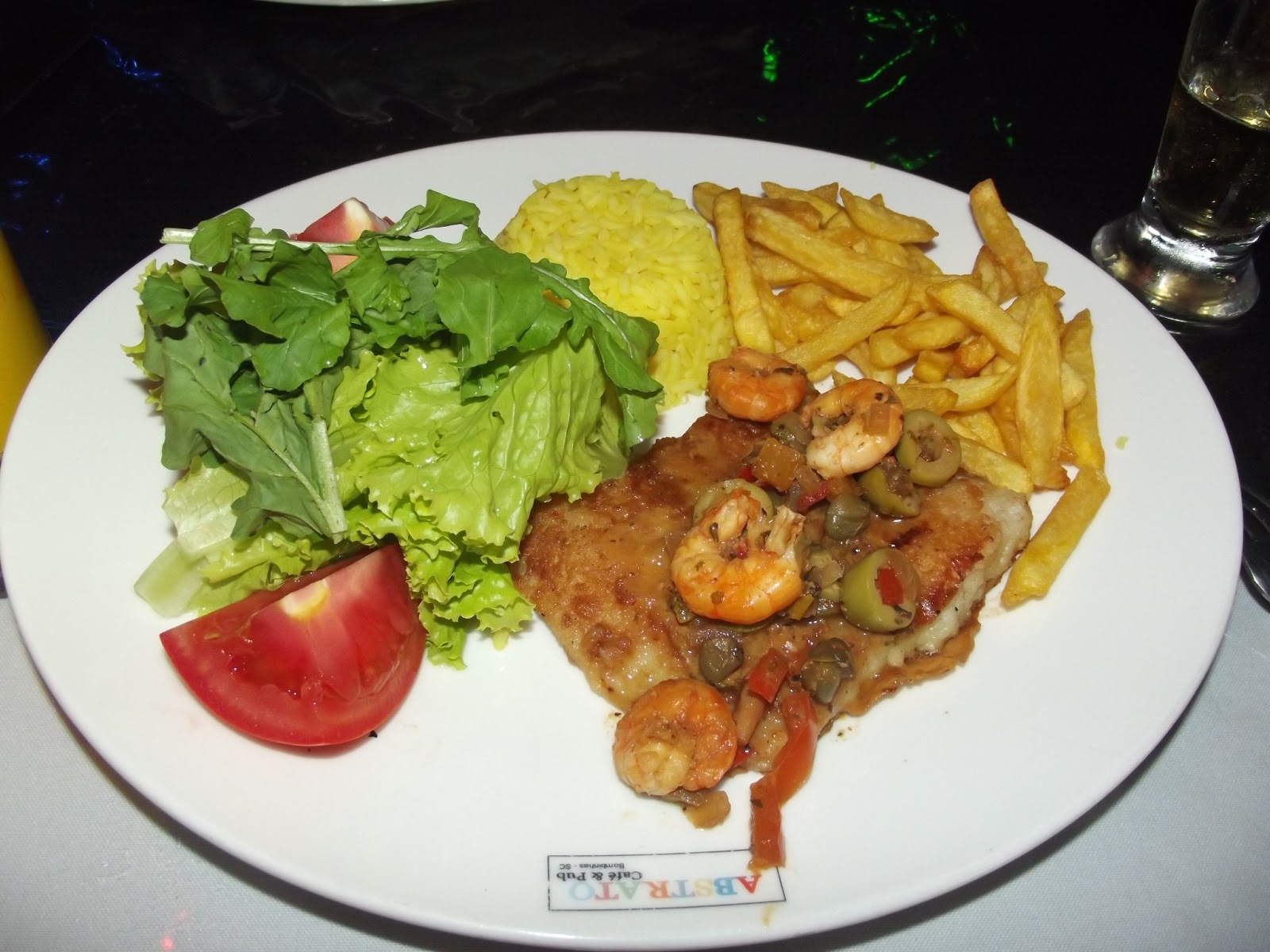 Logo que chegamos, serviram pães com molhos diversificados. No prato principal, escolhi frango grelhado, que veio acompanhado de fritas, arroz e salada. O Max, por sua vez, preferiu filé de peixe ao molho de camarão, também com o mesmo acompanhamento. E a comida estava deliciosa… Para beber, primeiro tomamos uma cerveja – que estava bem gelada – e depois fomos para o chope. Após o almoço, foi servido pudim de sobremesa, que também estava ótima.