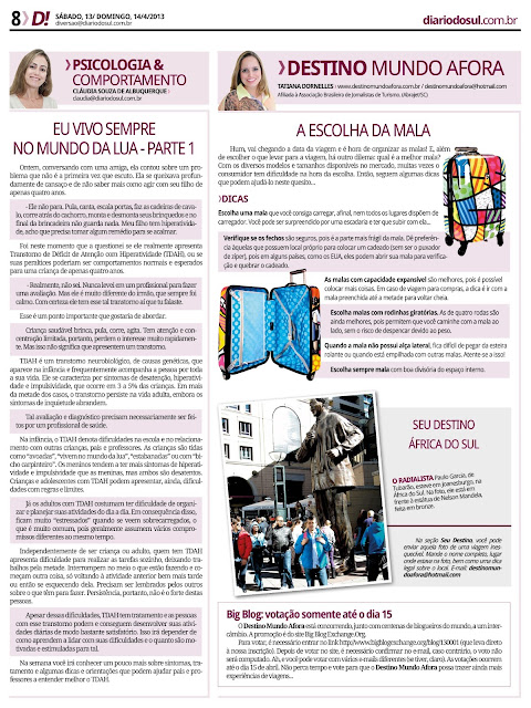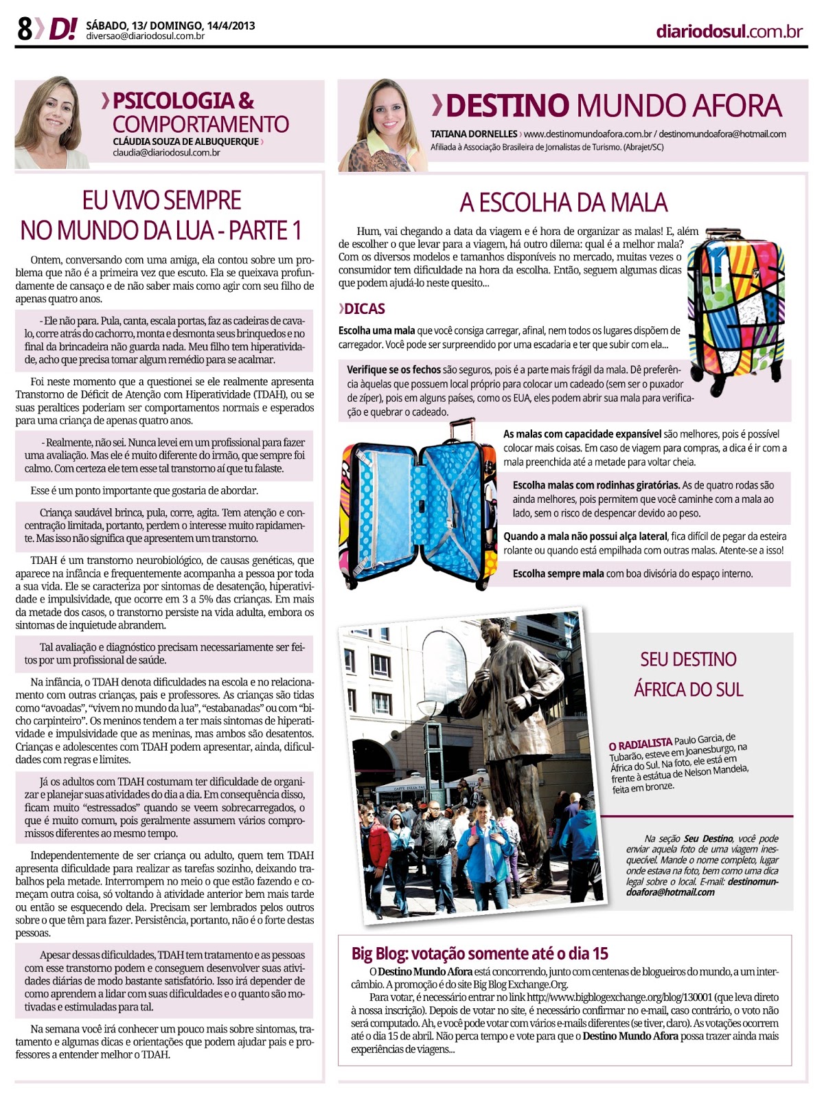13/04/2013 Destino Mundo Afora | Coluna 13 Postado por: Tatiana Dornelles Tweetar Coluna Destino Mundo Afora, no jornal Diário do Sul. Data: 13 e 14 de abril de 2013.