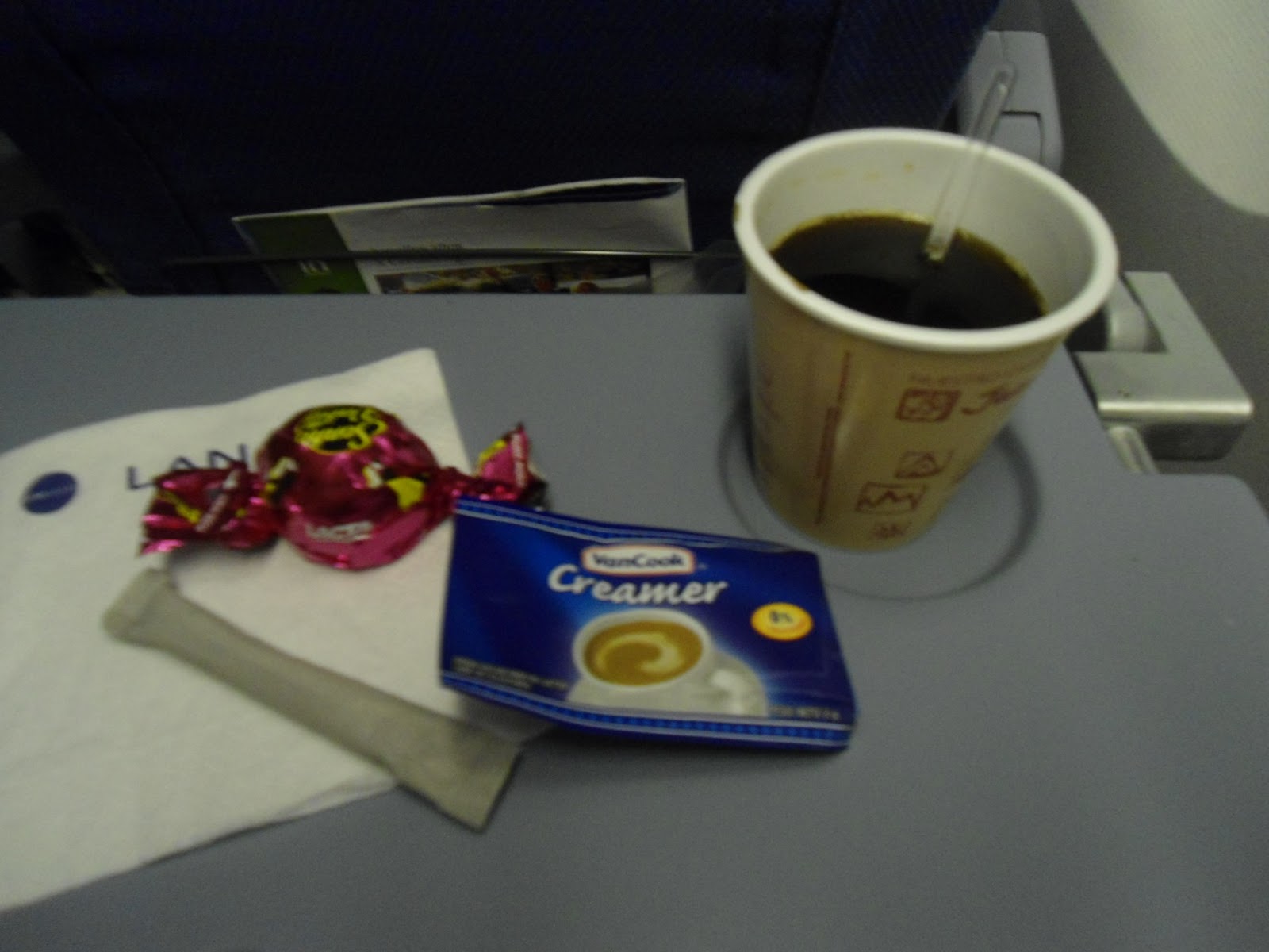 Logo em seguida, depois que os comissários recolhem os pratos e lixos, passaram perguntando se alguém queria café, refrigerante, se desejava mais vinho ou queria beber whisky. Pedi café com açúcar e ainda ganhei bombom Sonho de Valsa, distribuído a todos os passageiros.