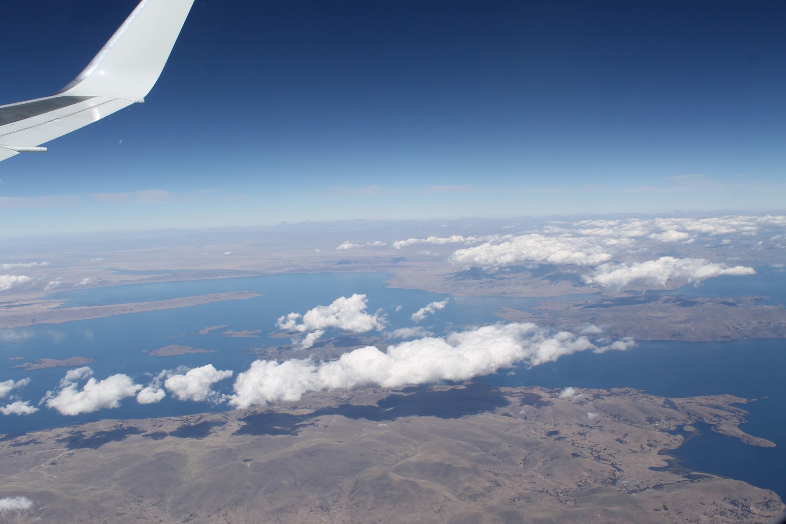 Durante este voo, o comissário indicava os momentos em que deveríamos abrir as janelas para visualizar a paisagem. Passamos pela Cordilheira dos Andes e pelo Lago Titicaca, no Peru, com águas extremamente azuis. Sensacional!