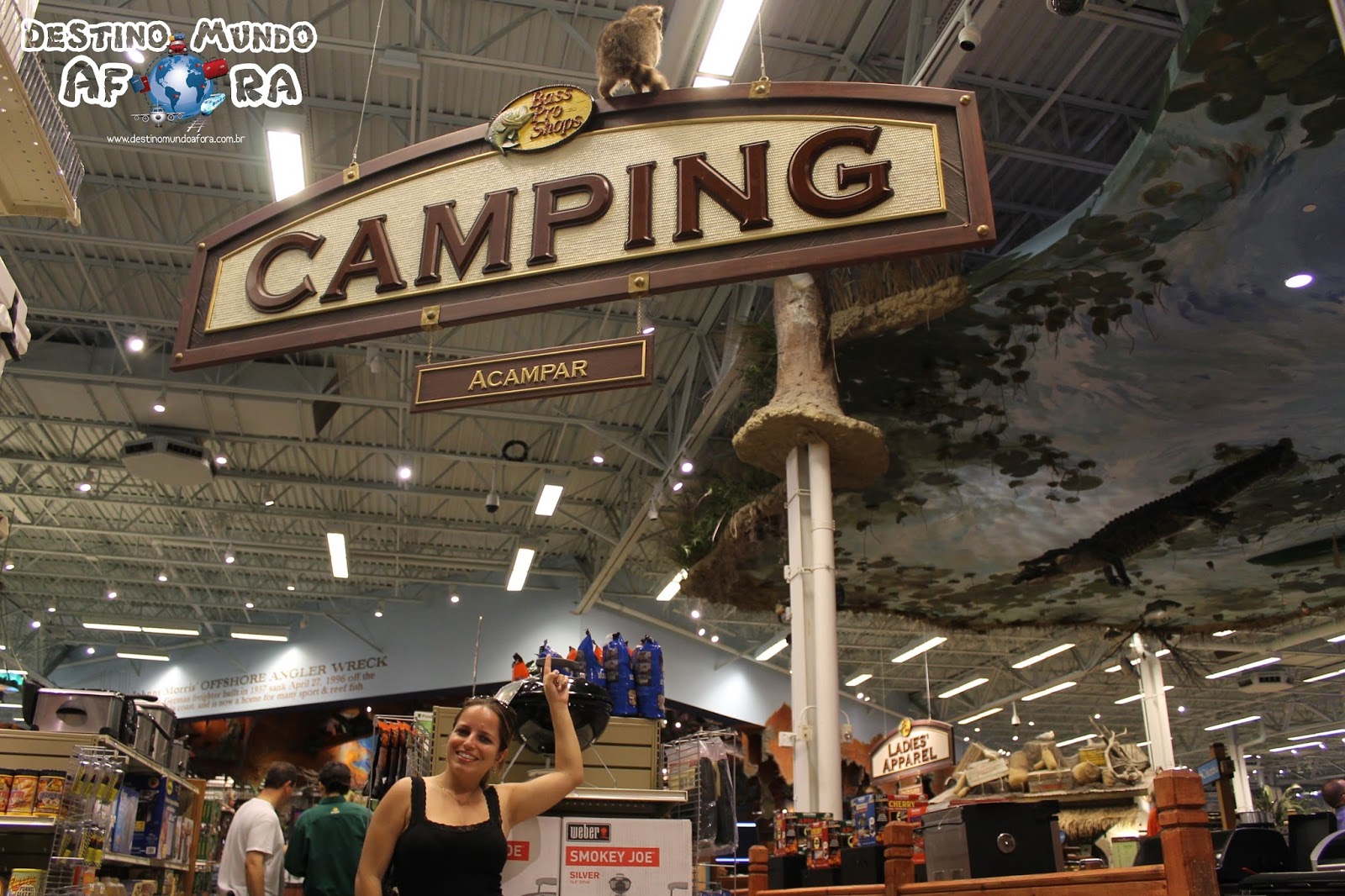 Outro aspecto que me chamou muito a atenção foi a própria decoração. Cada setor (caça, camping…) é decorado de acordo com o tema. Peixes, tubarões, ursos, entre outros animais, fazem parte do cenário, como se você realmente estivesse no meio do mar ou da floresta. Muito show!Confesso que não comprei nada para mim, nem o Max, porém a vontade de encher a mala com itens para acampamento foi grande. Já tínhamos combinado que esta viagem era mais para explorar a Flórida do que fazer compras, por isso, tive que me segurar. Claro que fiz algumas comprinhas… hehe Mas nesta loja compramos apenas as encomendas do meu pai e de nosso amigo.