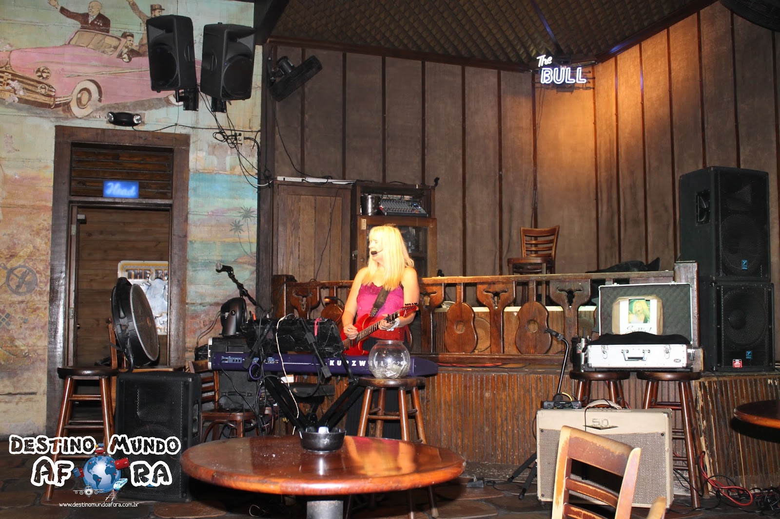 Chegamos em Key West durante a tarde e resolvemos esticar um pouco mais para podermos aproveitar o agito da noite. Um bar, o The Bull, chamou a atenção, não somente pelo rock americano que estava tocando quanto pela própria decoração. É daqueles bares que a gente vê em filmes: à meia-luz, com balcão no meio do estabelecimento e música ao vivo. A entrada somente é permitida para maiores de 21 anos, bem como a venda de bebidas alcoólicas. Fumantes são bem-vindos, pelo menos era o que estava escrito em um cartaz, bem na portaria.