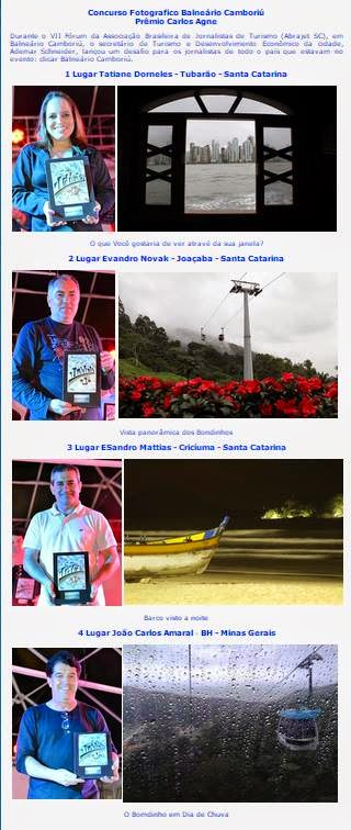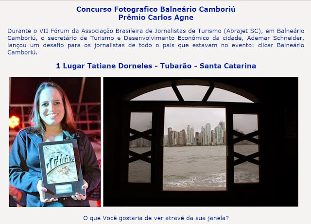 27/10/2013 Matéria no portal da Abrajet/SC sobre concurso de fotografia Postado por: Tatiana Dornelles Tweetar Tatiana Dornelles, do blog Destino Mundo Afora, aparece no site da Abrajet/SC sobre o 1º lugar no Concurso de Fotografia em Balneário Camboriú. Data: 27 de outubro de 2013 Confira o texto completo aqui.