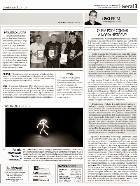 28/10/2013 Primeiro lugar em Concurso de Fotografia em Balneário Camboriú Postado por: Tatiana Dornelles Tweetar Tatiana Dornelles, do Destino Mundo Afora, está na página 3 do jornal Diário do Sul. Primeiro lugar no concurso de fotografia Prêmio Carlos Agne, em Balneário Camboriú. Data: 28 de outubro de 2013.