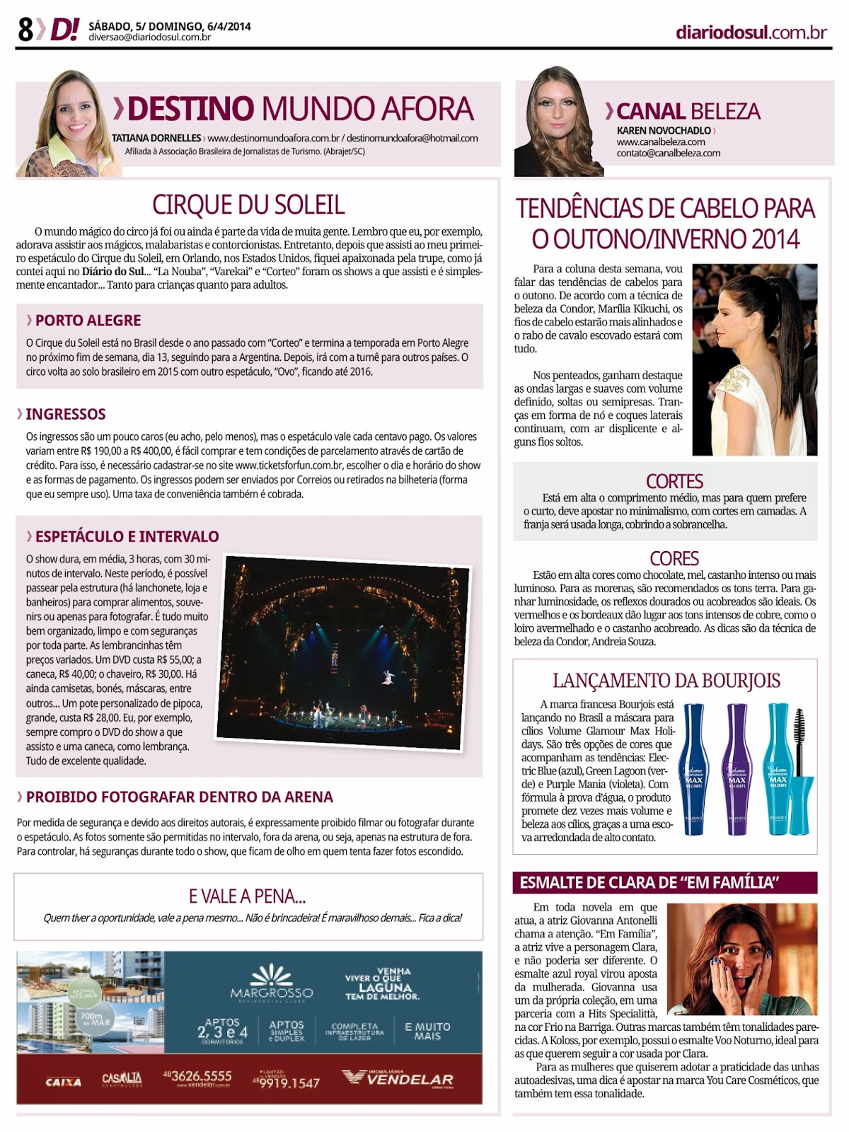 05/04/2014 Destino Mundo Afora | Coluna 63 Postado por: Tatiana Dornelles Tweetar Coluna Destino Mundo Afora no jornal Diário do Sul. Data: 5 e 6 de abril de 2014. Gostou?Então, deixe seu comentário, curta nossa fanpage no Facebook e siga nosso perfil no Twitter e no Instagram.