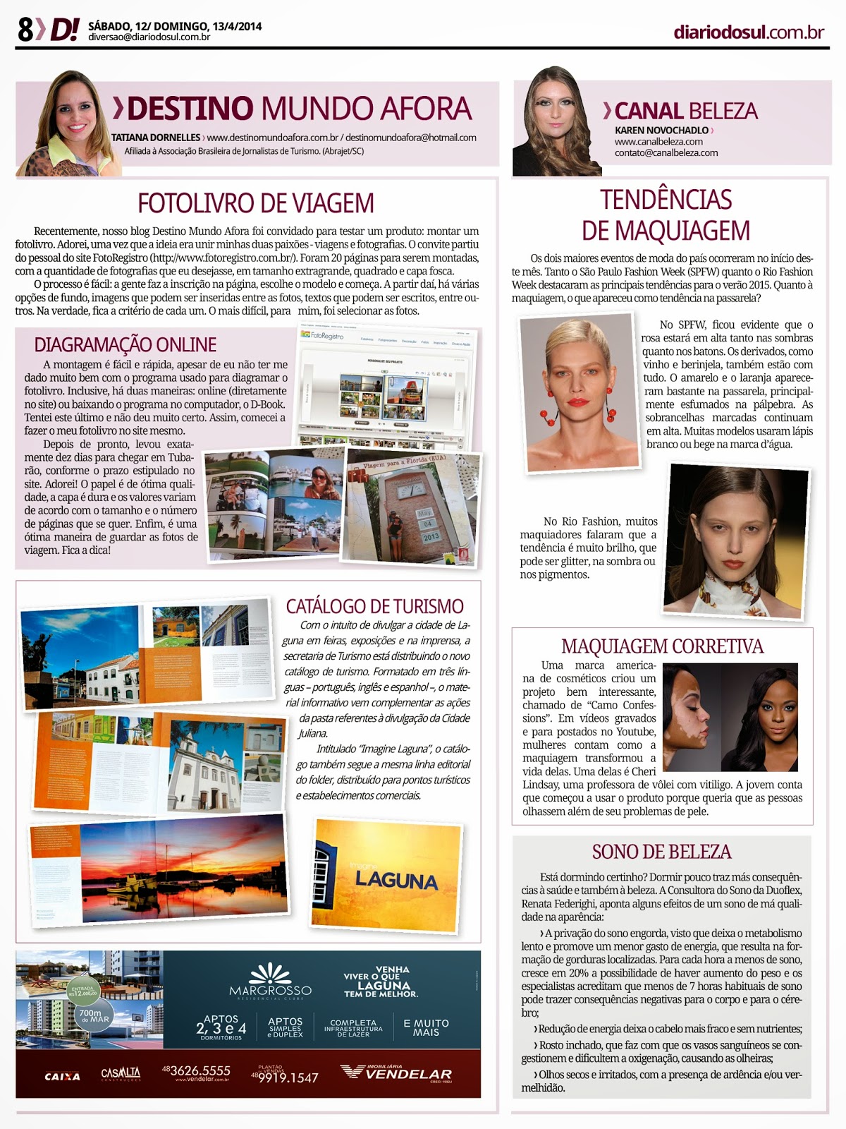 13/04/2014 Destino Mundo Afora | Coluna 64 Postado por: Tatiana Dornelles Tweetar Coluna Destino Mundo Afora no jornal Diário do Sul. Data: 12 e 13 de abril de 2014. Gostou?Então, deixe seu comentário, curta nossa fanpage no Facebook e siga nosso perfil no Twitter e no Instagram.