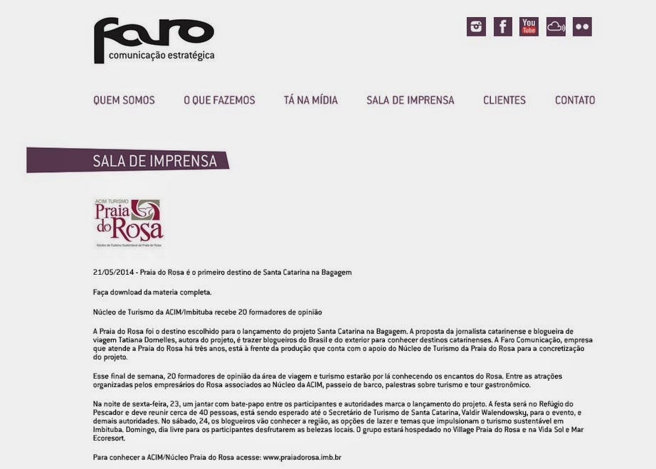 Matéria do projeto Santa Catarina na Bagagem no site da Faro Comunicação