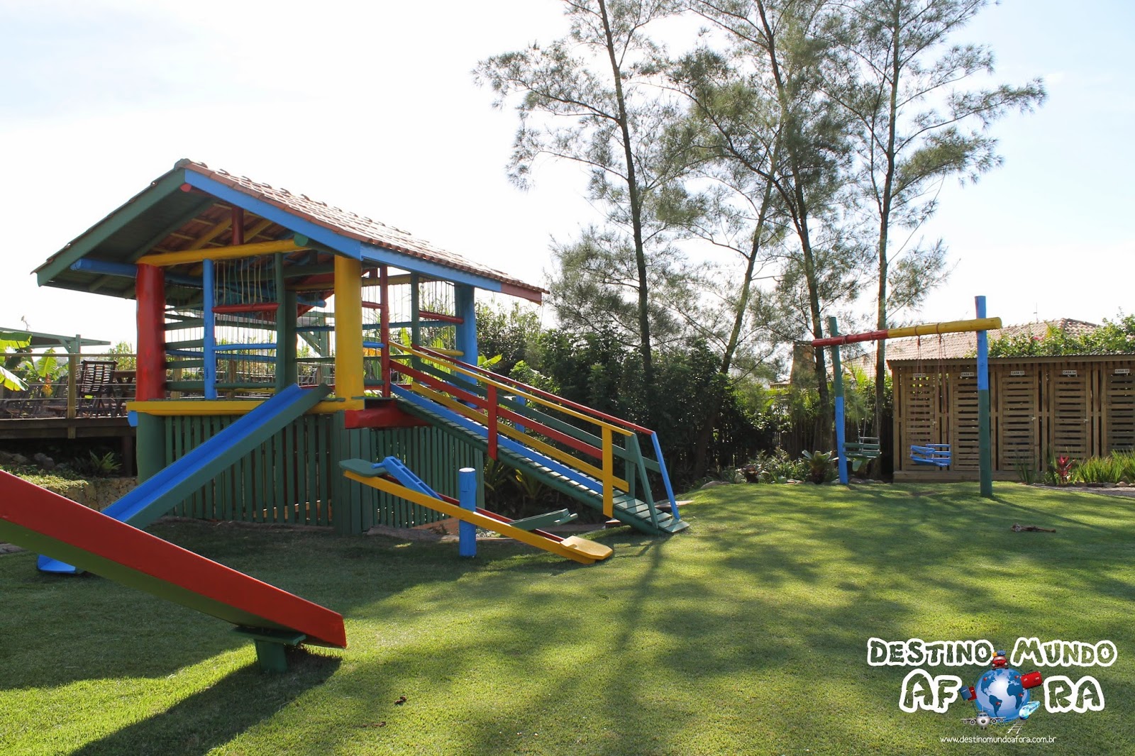Já quem quer usufruir da estrutura da pousada, há piscina e academia. As crianças podem aproveitar o playground. De praticamente todos os lugares, já que a pousada é no morro, é possível ver o mar. É cada visual incrível, que é difícil descrever aqui… Quem curte praia, há acesso privado, com senha. Próximo ao portão que dá para a areia, tem ainda portas com cadeiras, guarda-sol e carrinho. As portas são por número da cabana e para abrir é necessário usar a senha (disponível no quarto). Para os esportistas de plantão – o que não é nosso caso – há ainda quadra de tênis…