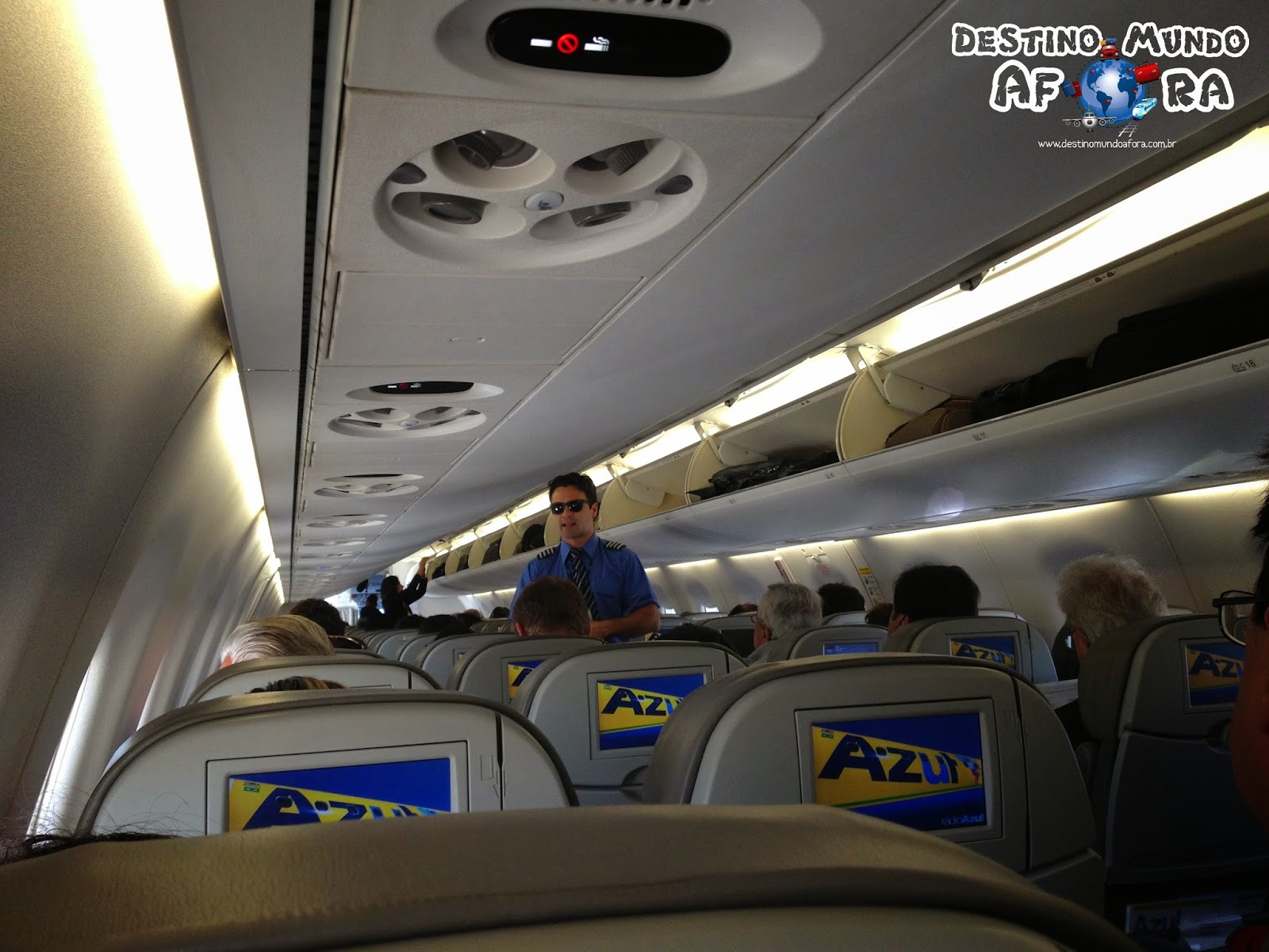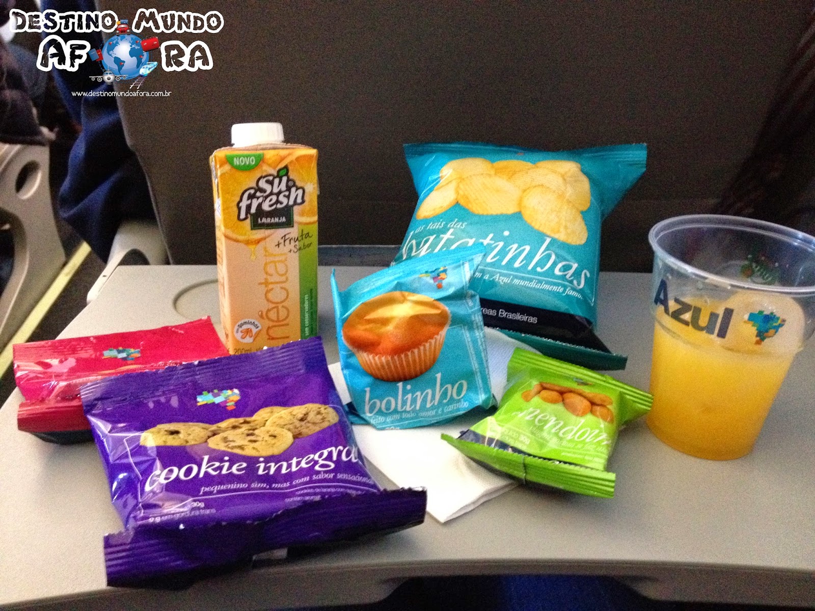 O jato, um Embraer 195, tem capacidade para 124 passageiros e a Azul é a maior operadora do modelo de aeronave no mundo. Inclusive, o lanche foi caprichado (as outras empresas não oferecem tantas opções): suco de pêssego ou laranja, cookie integral com gotas de chocolate, bolinho de laranja e balas em formato de avião.