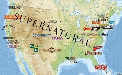Inclusive, em algumas pesquisas que realizei em sites sobre locações do cinema, muito aprendi… Por exemplo, achei alguns mapas bem legais com os lugares onde ocorrem as principais séries, animações e filmes. Os dois primeiros (abaixo) foram feitos pelo site Ligado em Série. A diferença entre os dois, é que o mapa “As Capitais das Séries 2.0” está mais completo, inclusive com o Havaí, para mostrar a série “Hawaii 5-0”, a qual assisto também.