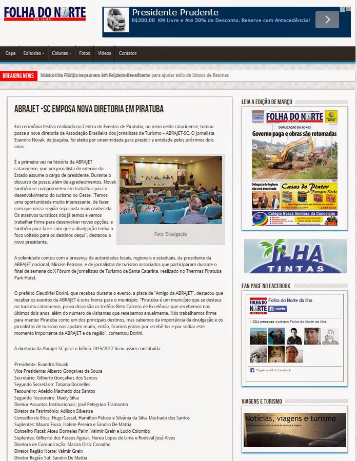 Tatiana Dornelles, do blog Destino Mundo Afora, aparece no site da Folha do Norte da Ilha sobre a posse da nova diretoria da Abrajet/SC. A jornalista e blogueira é segunda secretária do biênio 2015/2017.