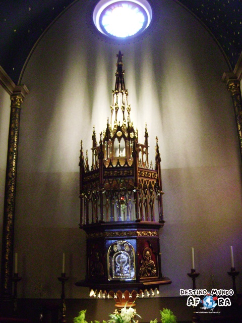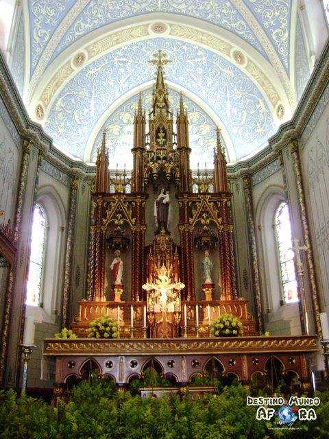 Por dentro, a Catedral é toda ornamentada. Desde os pilares ao teto, tanto da parte central quanto das laterais. As janelas em formato de ogivas são todas acompanhadas de pinturas. O que me chamou muito a atenção foram duas pinturas. Uma é a da abóbada central que fica em cima do altar-mor. É um azul celeste lindíssimo. Quando a luz das janelas laterais incide, a impressão é que é o céu mesmo.